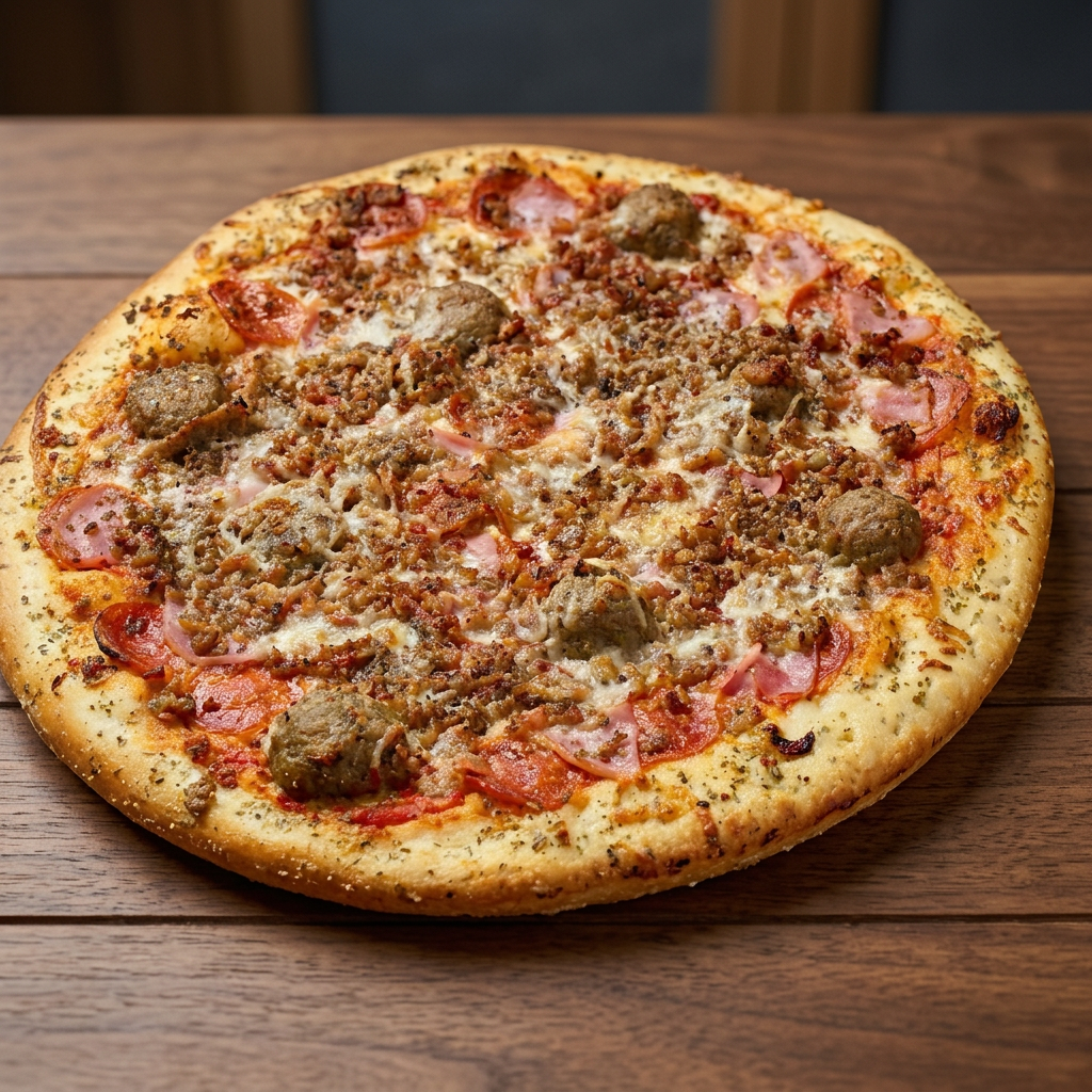 Loaded with pepperoni, canadian bacon, ground beef, pork sausage crumbles, bacon, and Italian Meatballs. Feeds 4-5