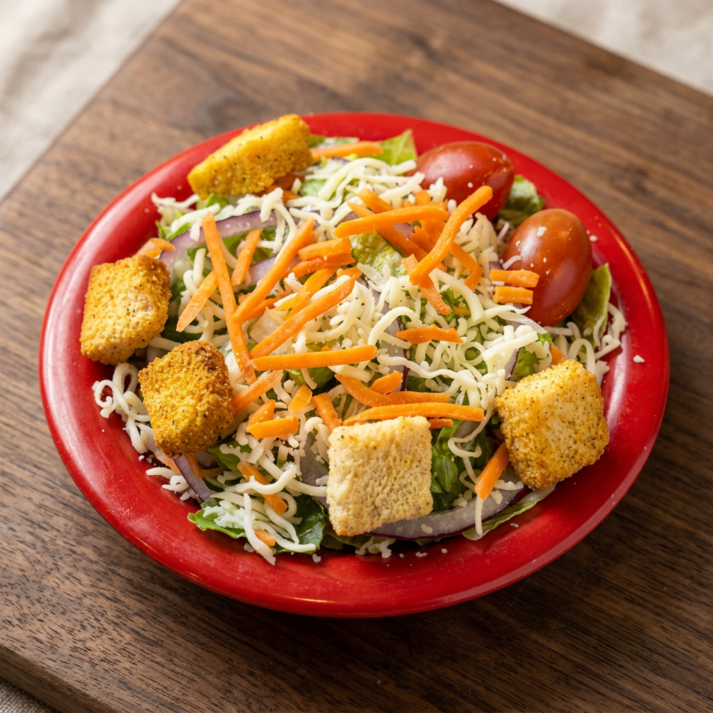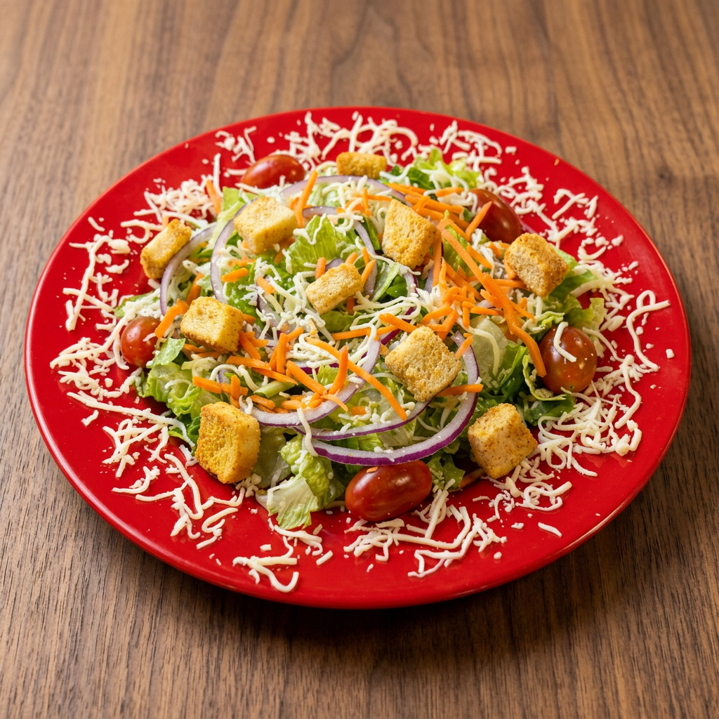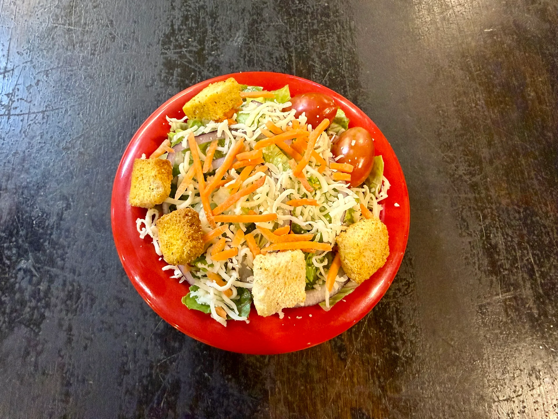 Fresh greens, red onion, carrots, cheese, tomatoes, and croutons.