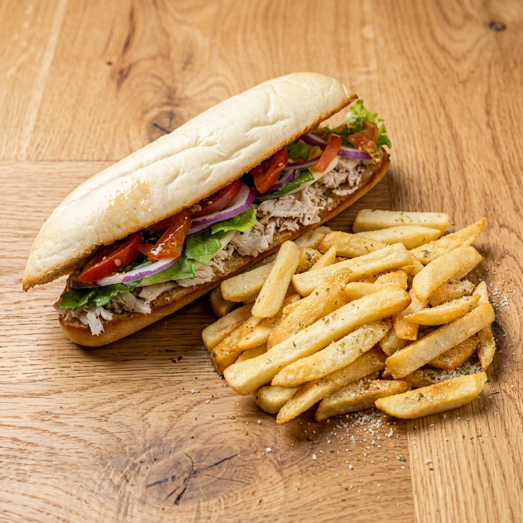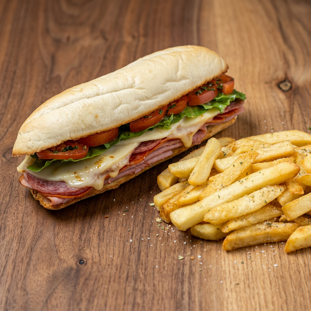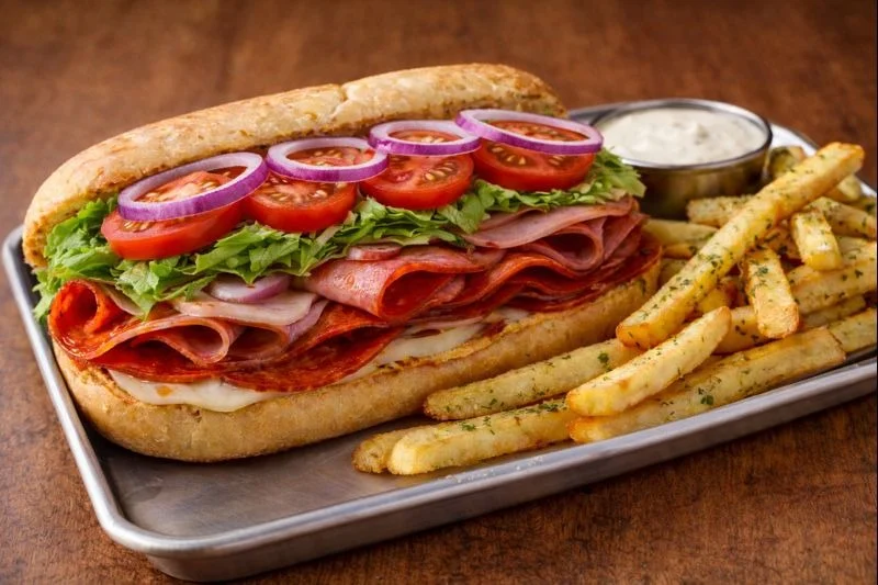Pepperoni, salami, ham, and provolone topped with lettuce and our tomato-onion dressing. Includes fries and a side of house-made ranch. Substitute a side salad for $1.