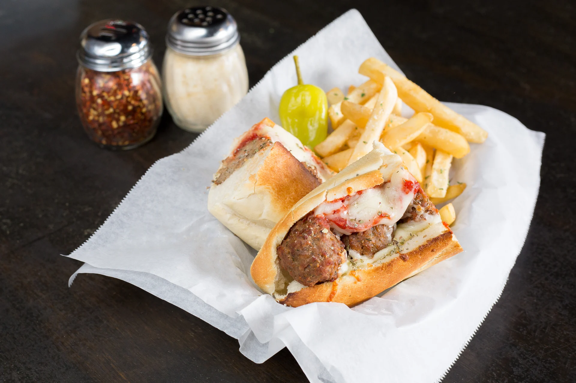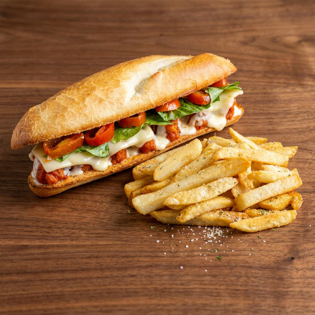Italian meatballs coated with zesty marinara and plenty of melted mozzarella. Includes fries and a side of house-made ranch. Substitute a side salad for $1.