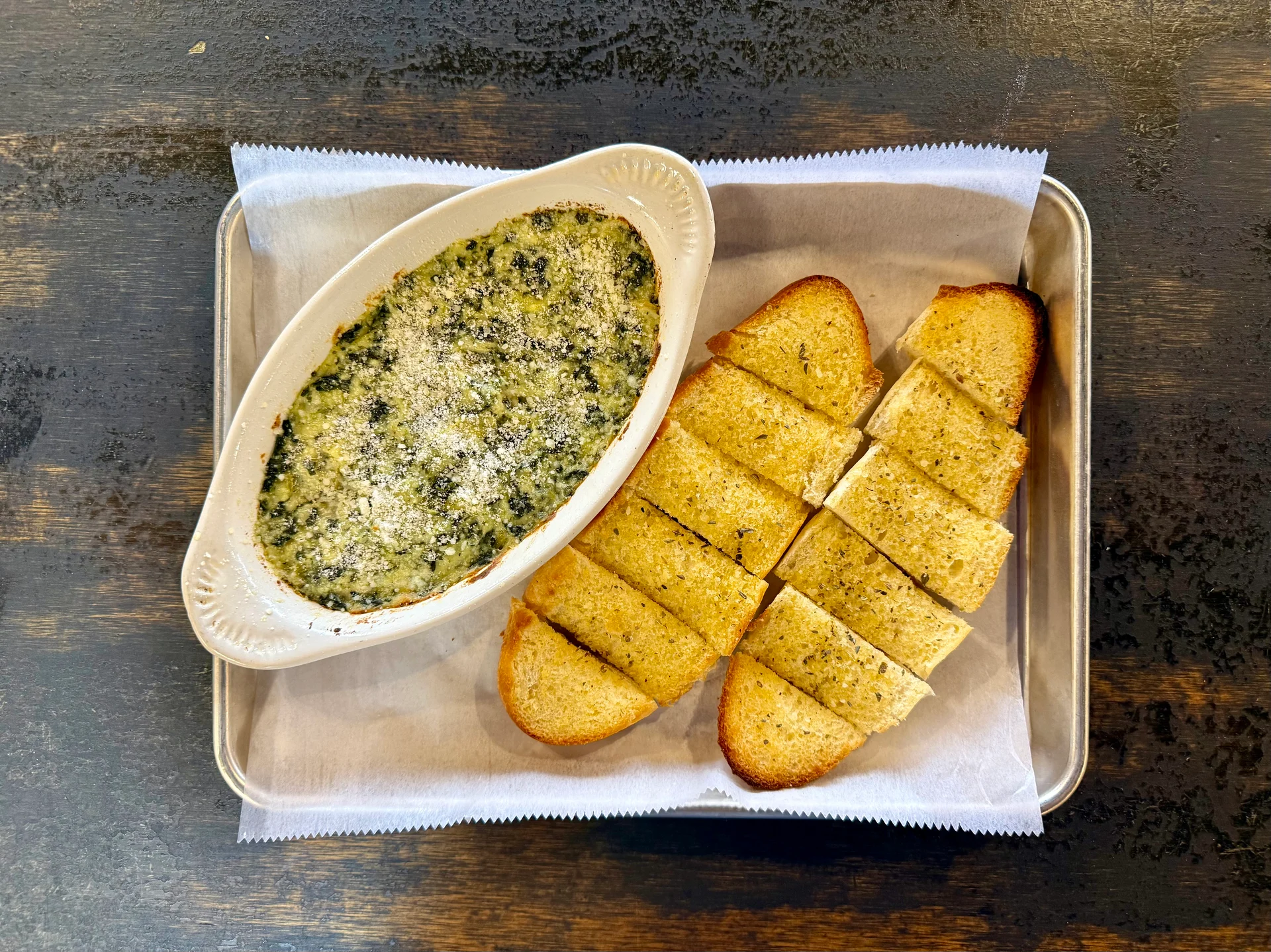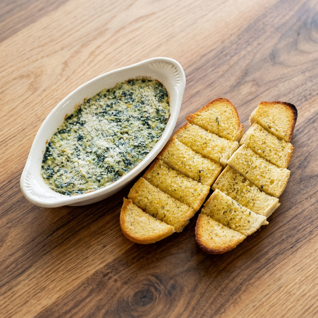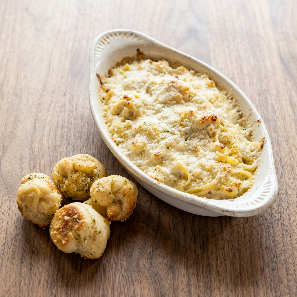 Creamy, delicious, and fresh baked, garnished with parmesan cheese. Served with fresh bread slices brushed in garlic butter.