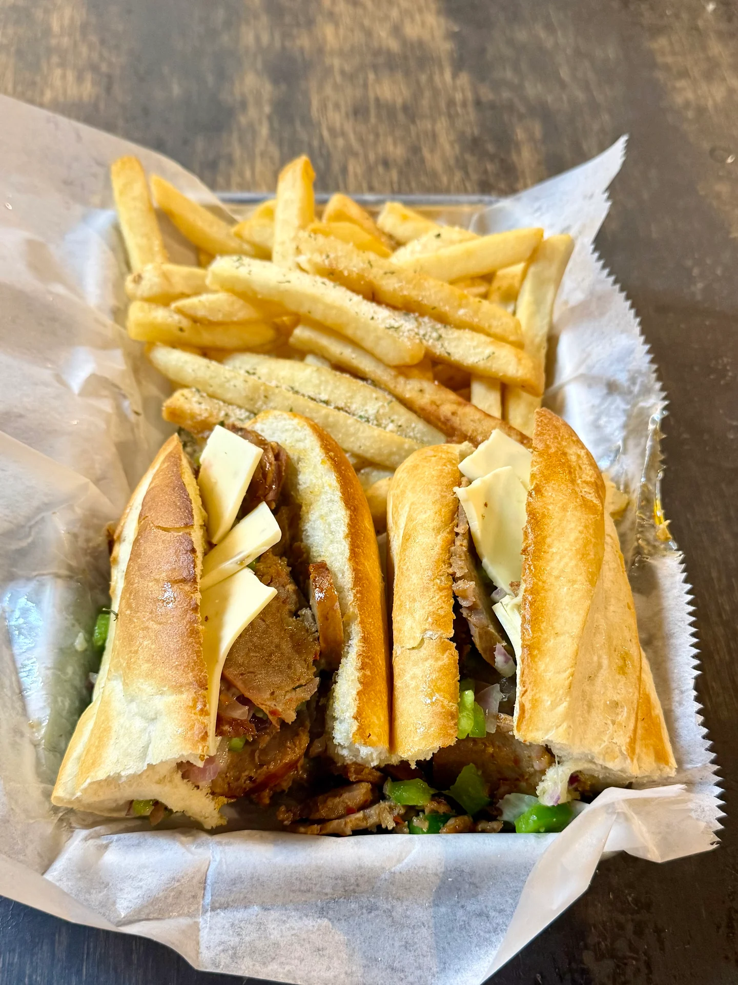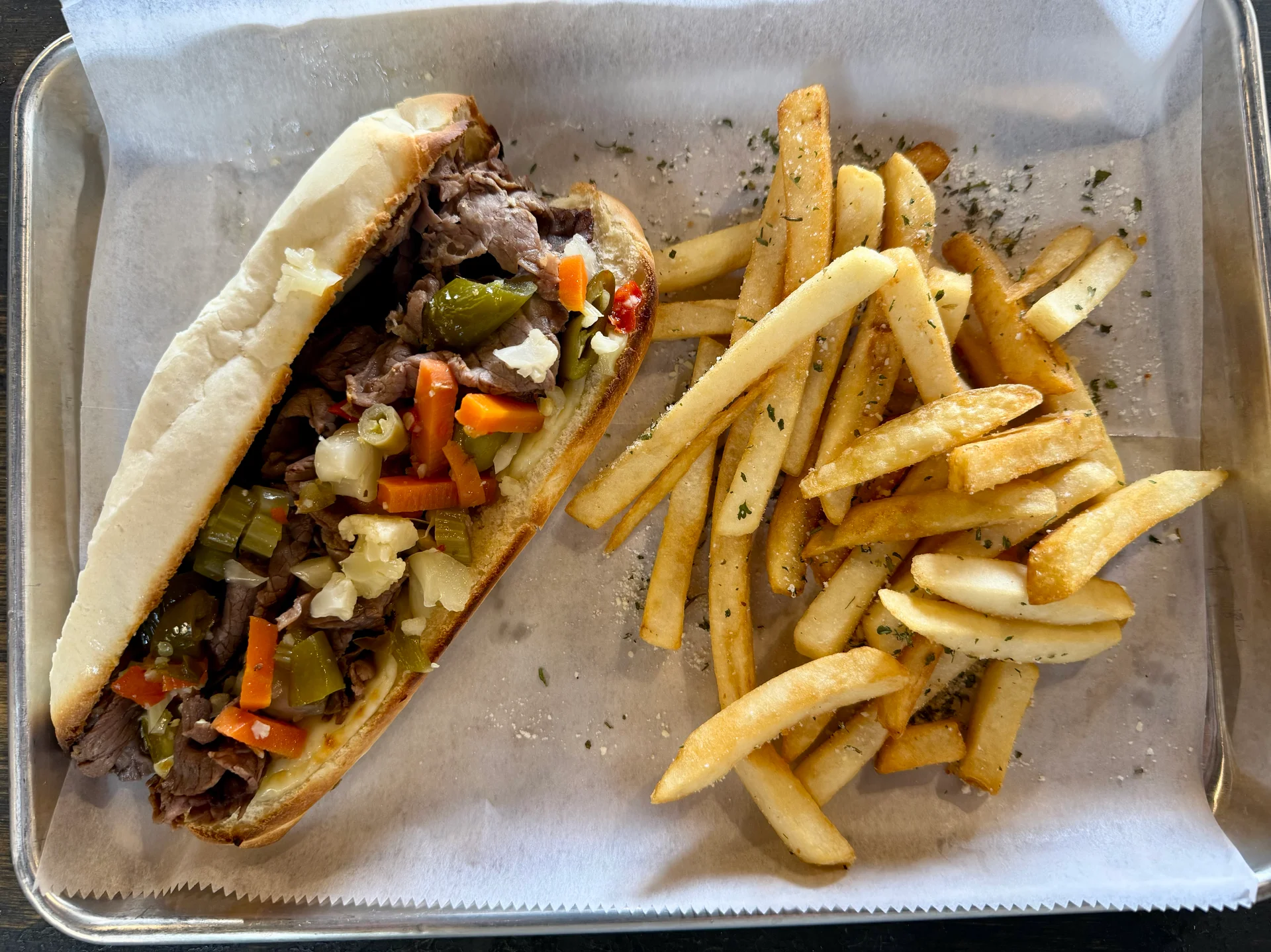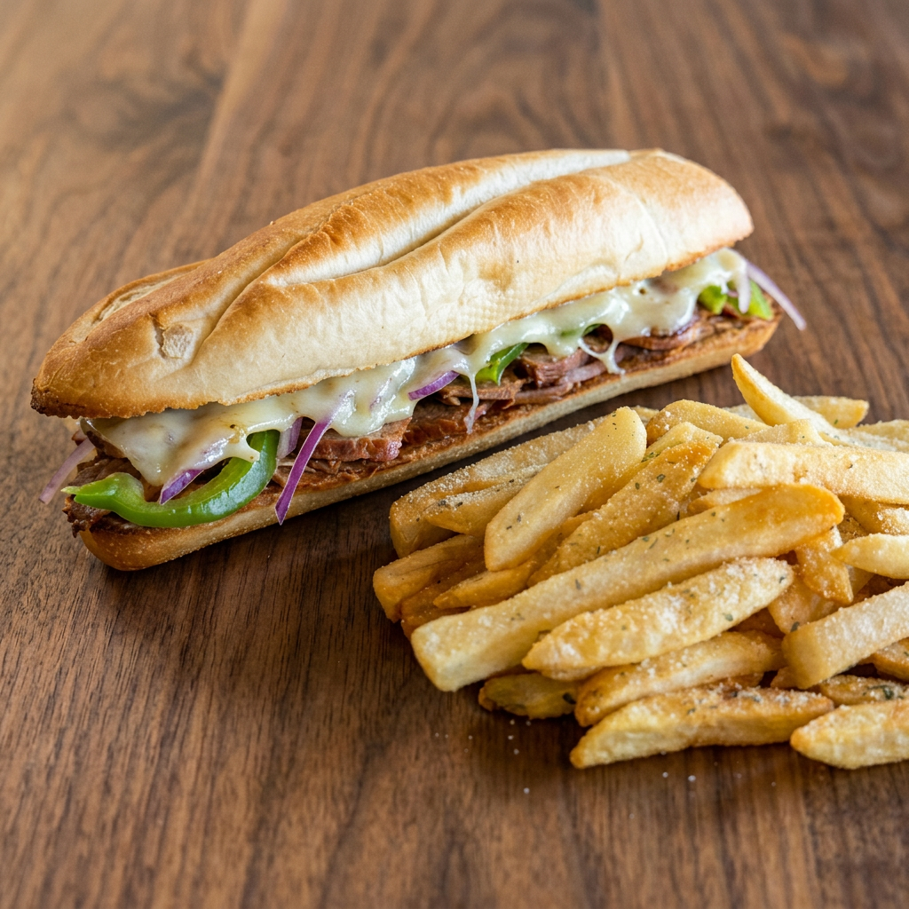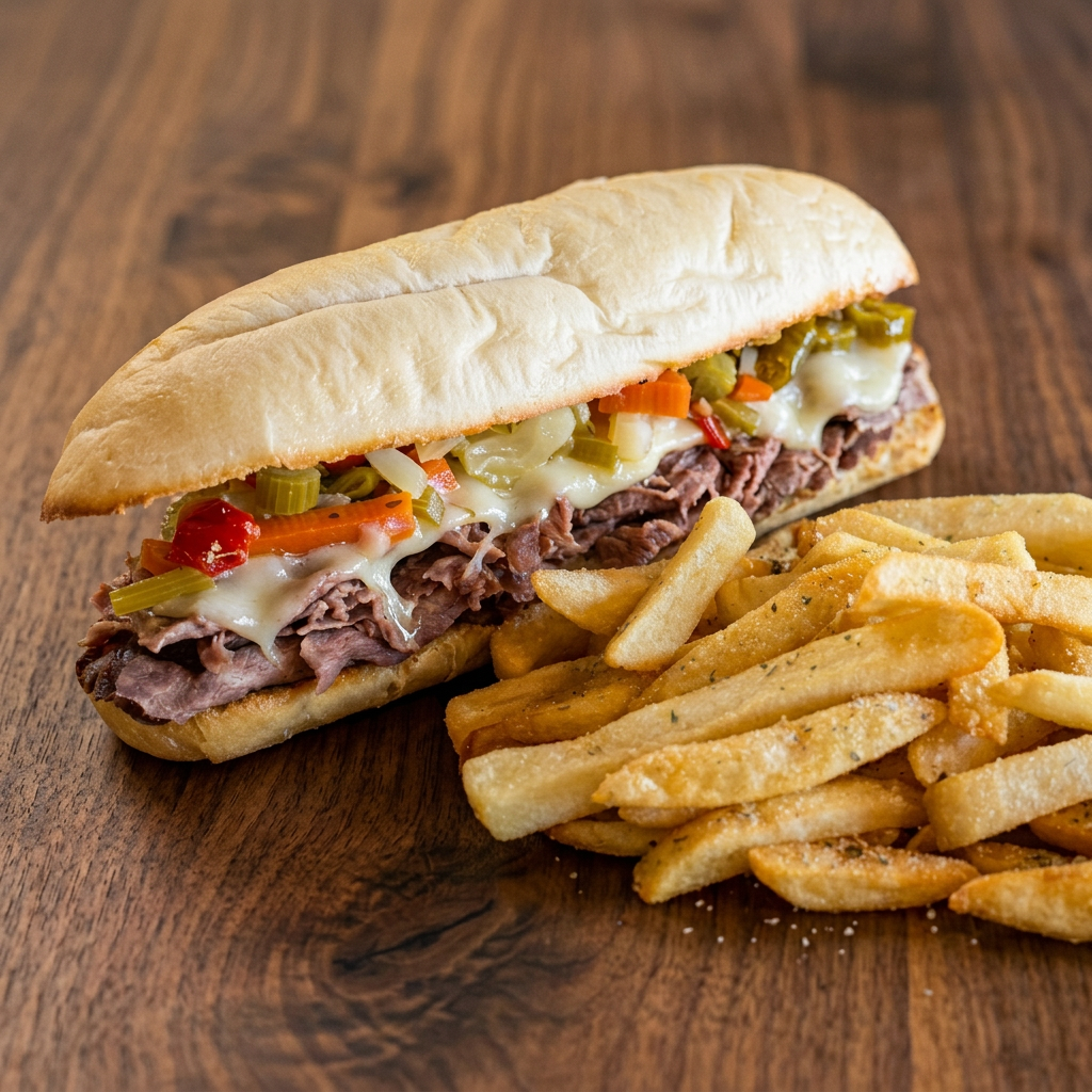 Italian beef piled high topped with provolone, hot pepper mix, served with au jus on the side. Includes fries and a side of house-made ranch. Substitute a side salad for $1.