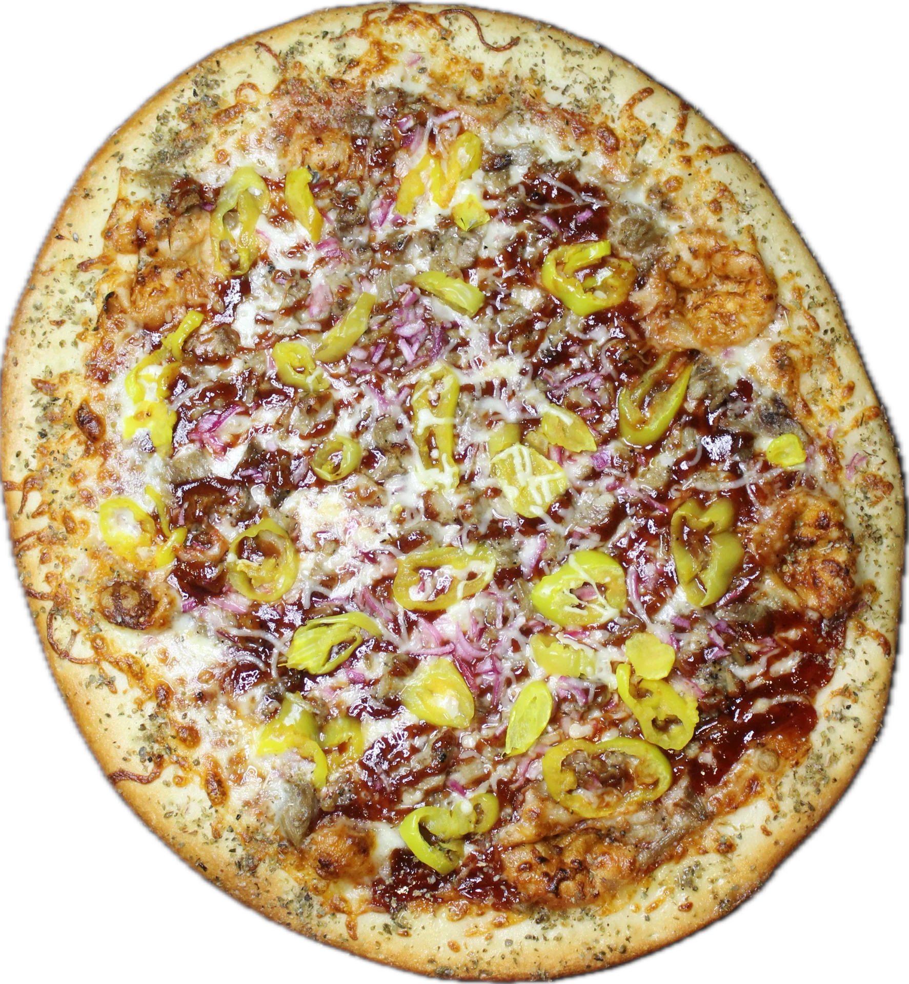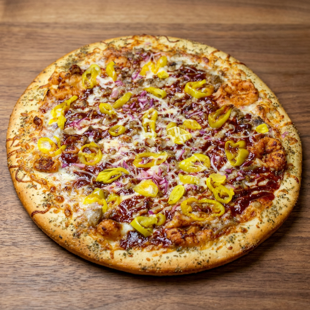 BBQ sauce base with mozzarella, red onion, banana peppers, and your choice of roasted chicken or pork. Feeds 4-5.