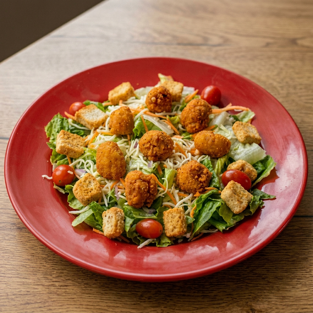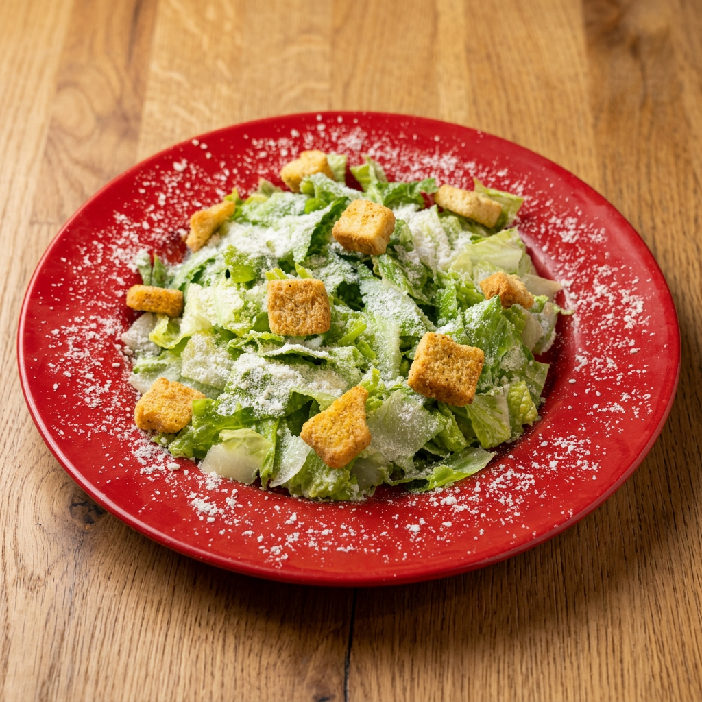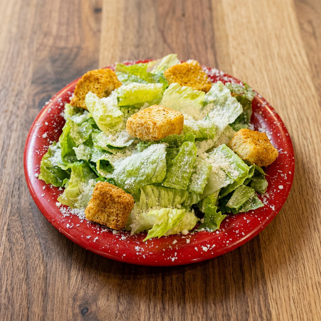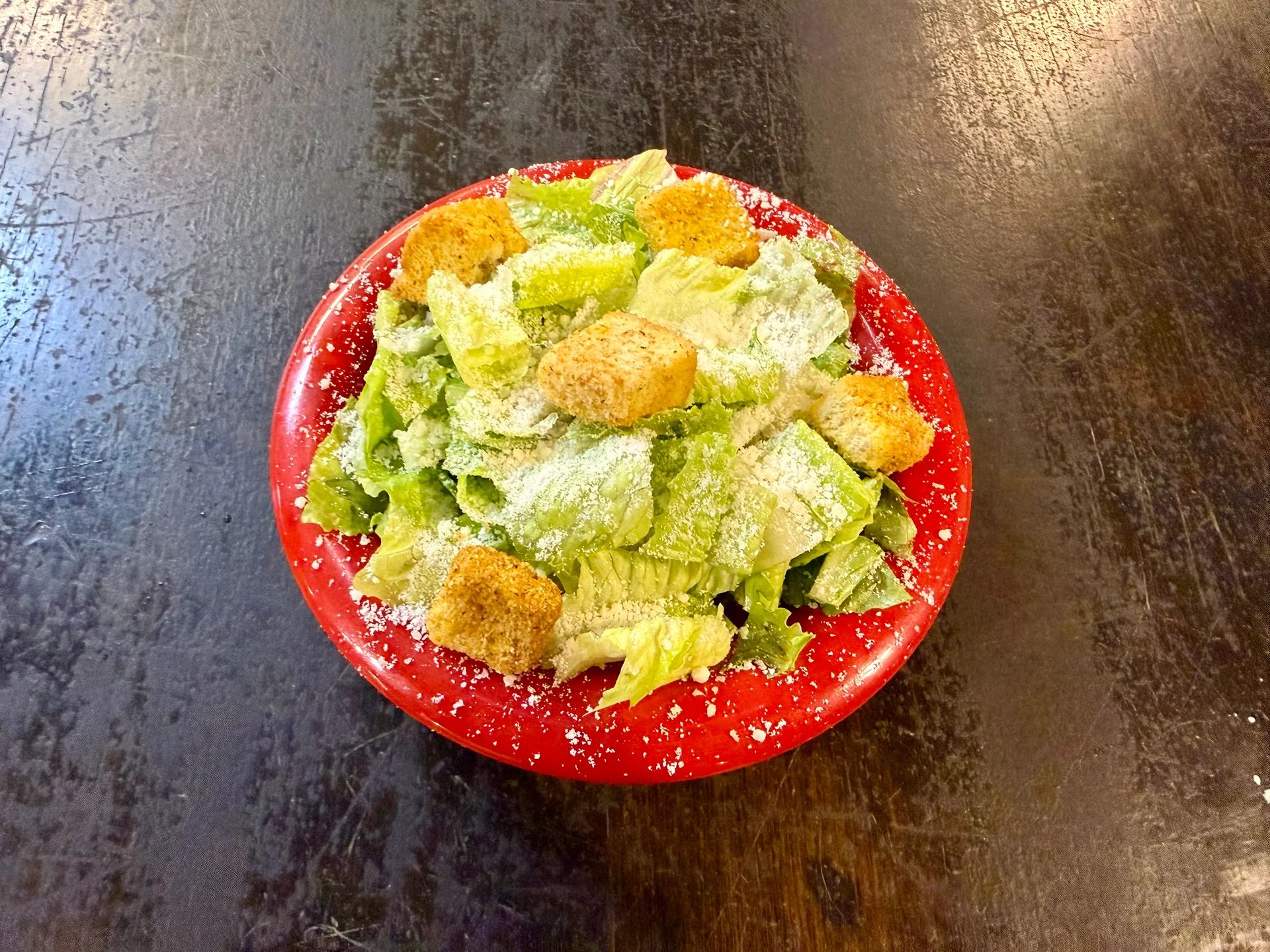 Fresh greens, croutons, and parmesan cheese.