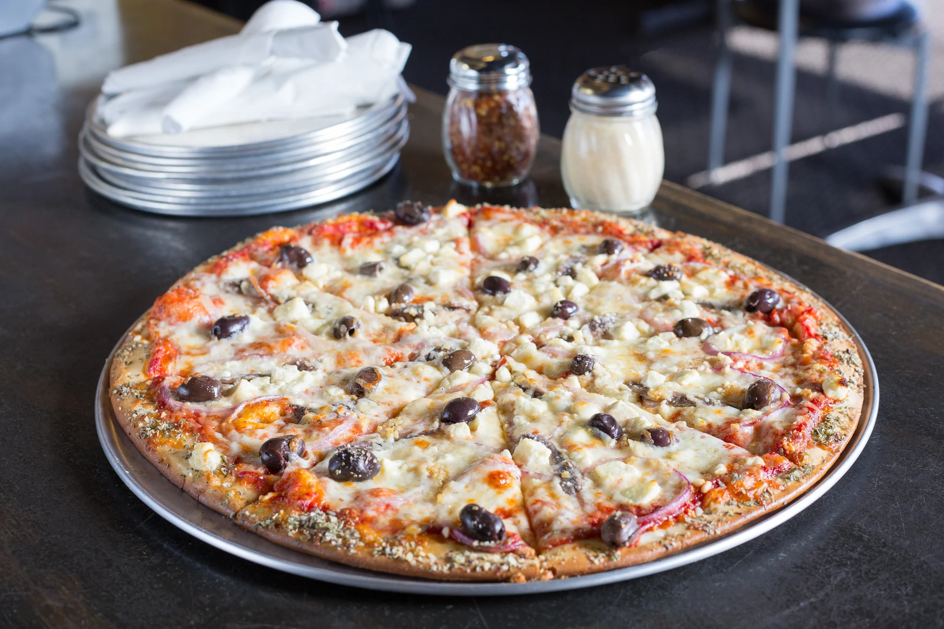 Red onions, feta, minced garlic, kalamata olives, and roasted chicken. Feeds 4-5