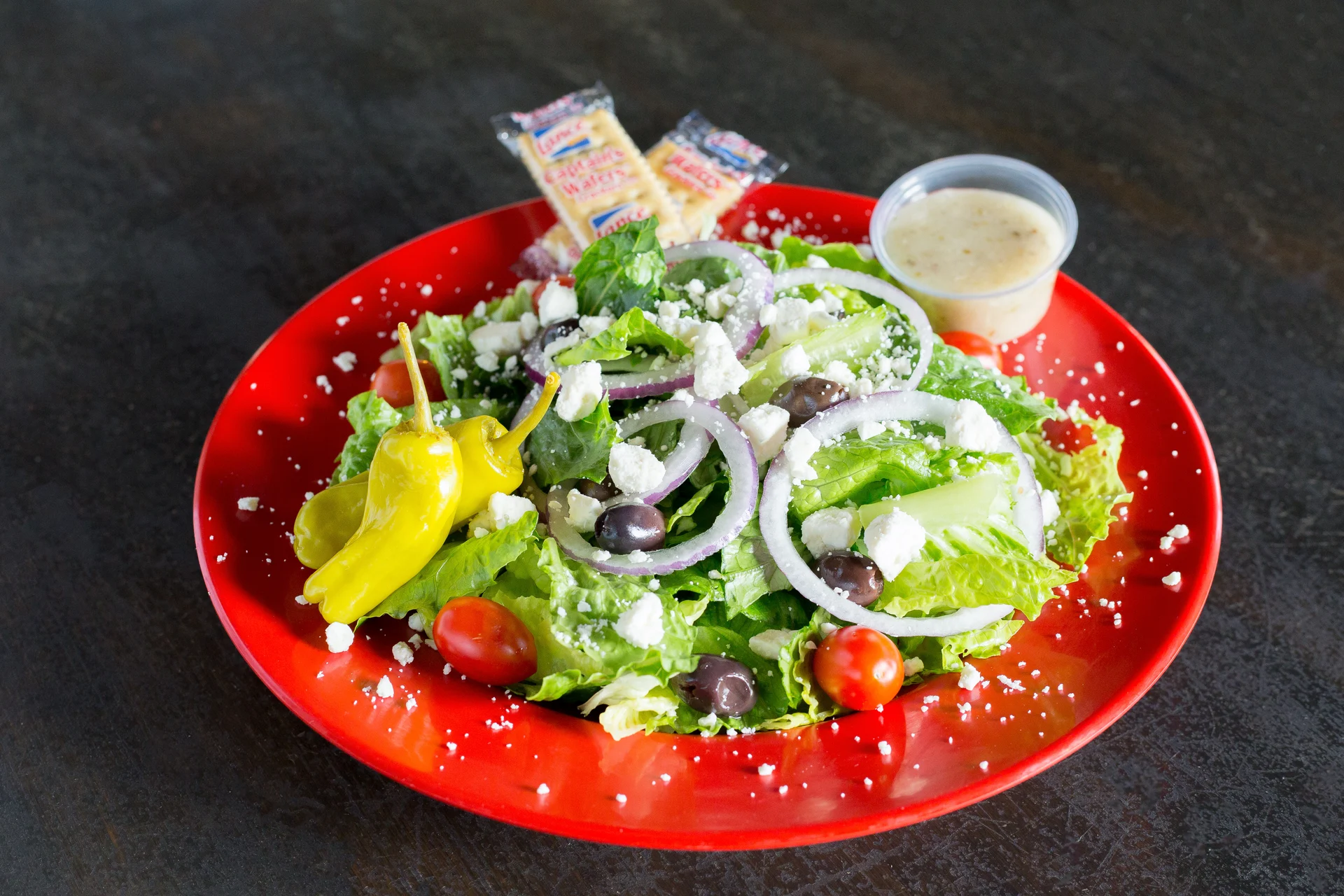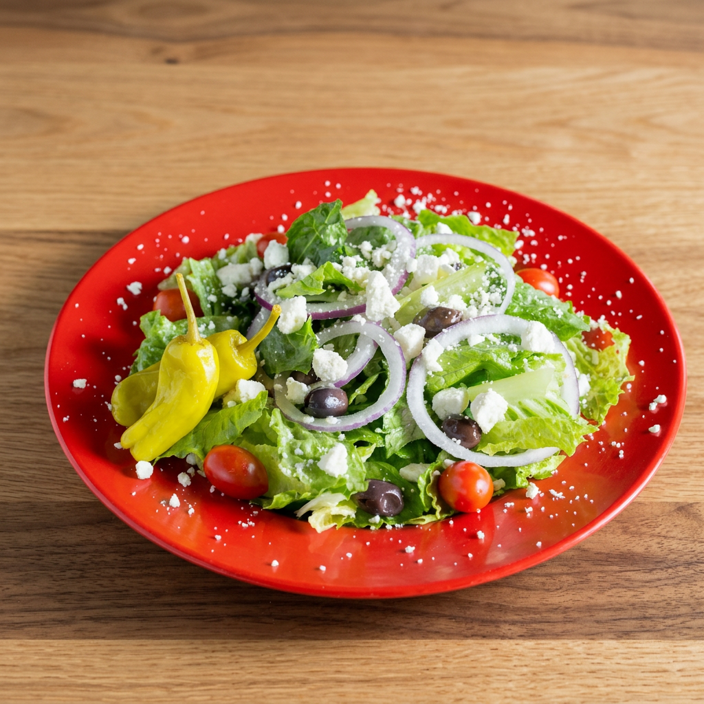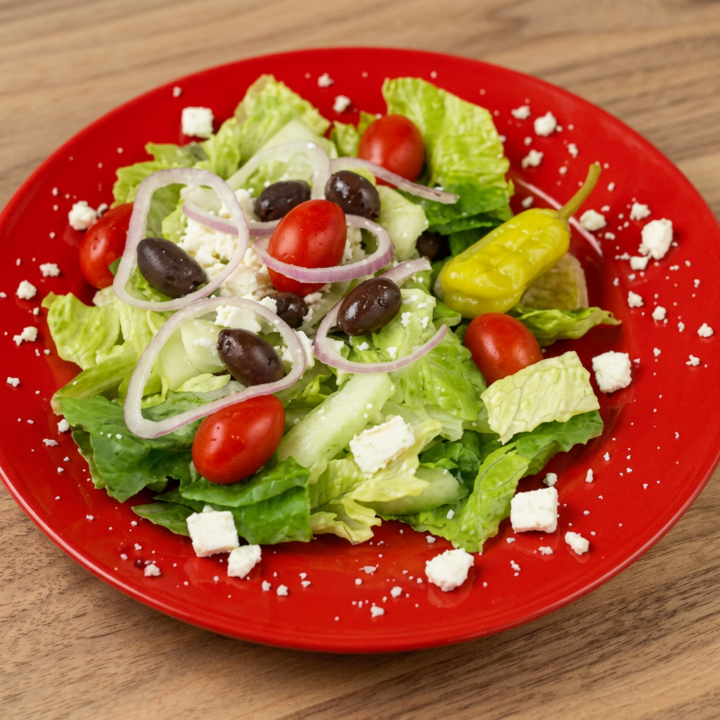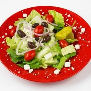 Fresh greens, tomatoes, red onion, feta, pepperoncini, kalamata olives and greek vinaigrette.