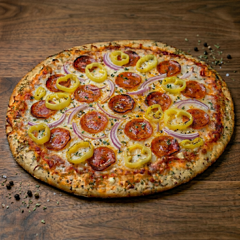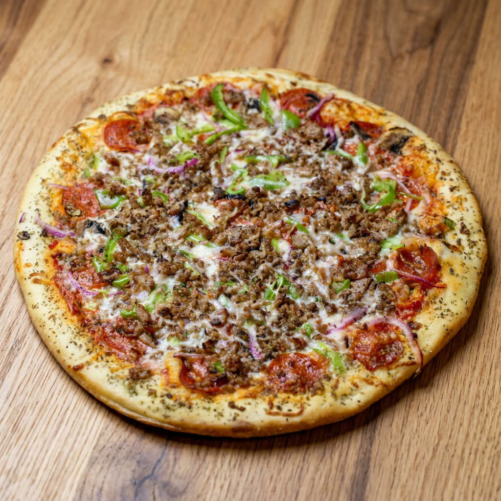 Pepperoni, pork sausage crumbles, ground beef, red onions, mushrooms, and green peppers. Feeds 2-3
