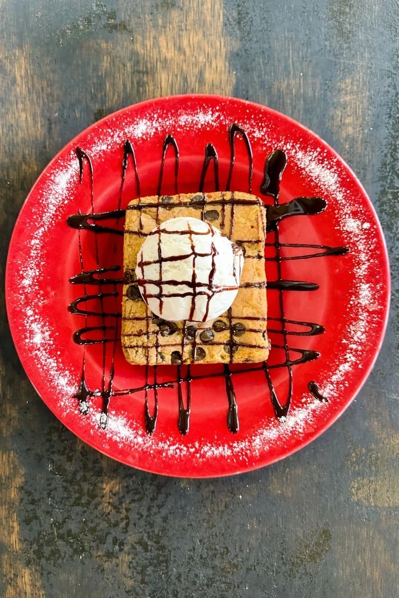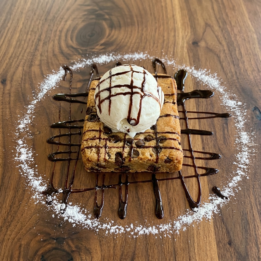 Giant blondie brownie served warm, topping with vanilla ice cream and drizzled with chocolate sauce.