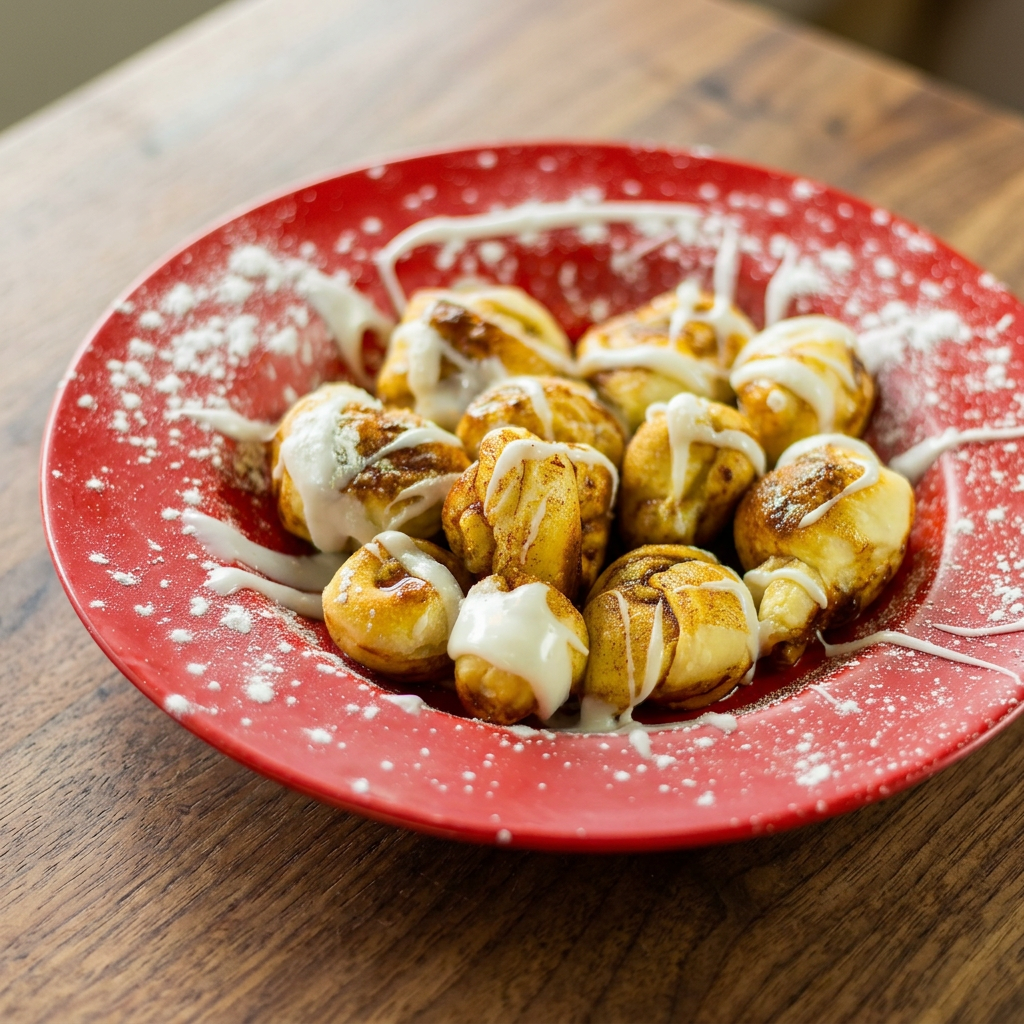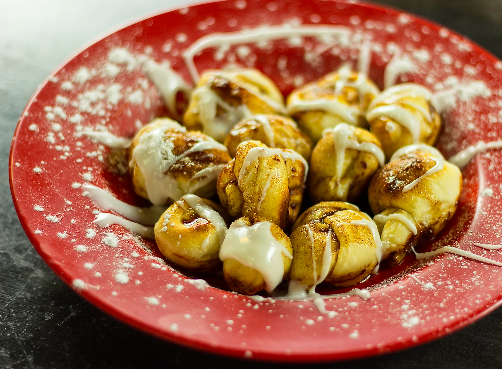 1/2 pound of our delicious dough tied in knots, covered with cinnamon sugar, baked to perfection, and topped with icing and powdered sugar.
