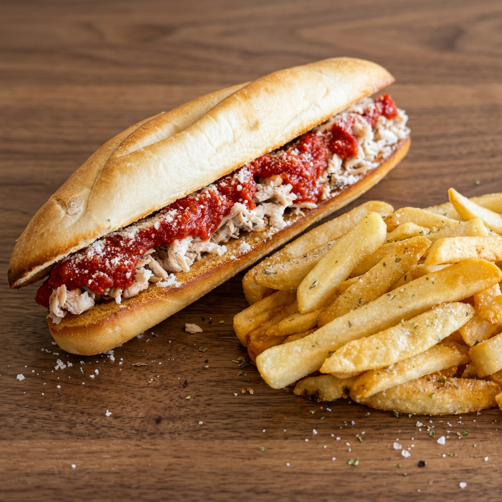 Choice of roasted or fried chicken topped with marinara and parmesan cheese. Includes fries and a side of house-made ranch. Substitute a side salad for $1.