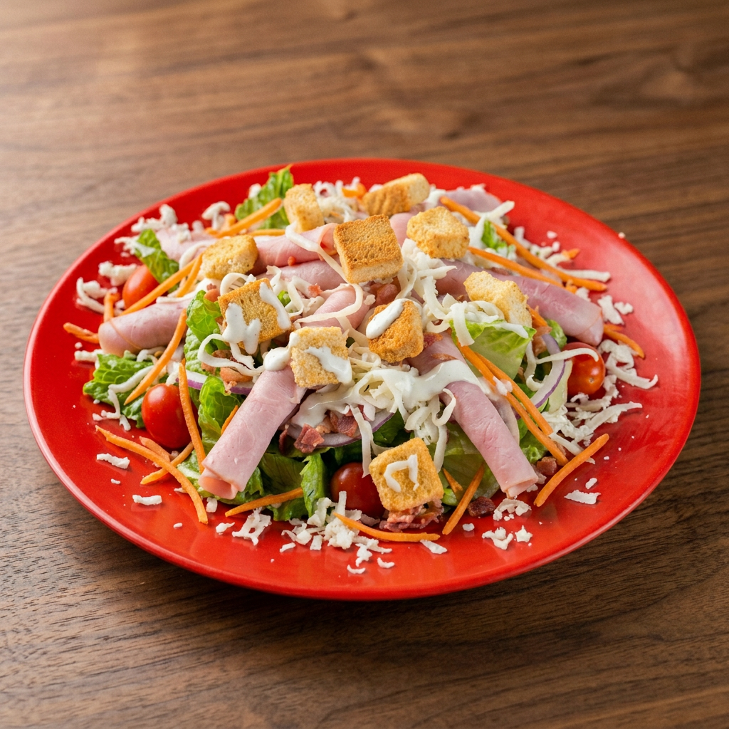 Fresh greens, tomatoes, red onion, carrots, cheese, sliced ham, croutons and bacon crumbles.
