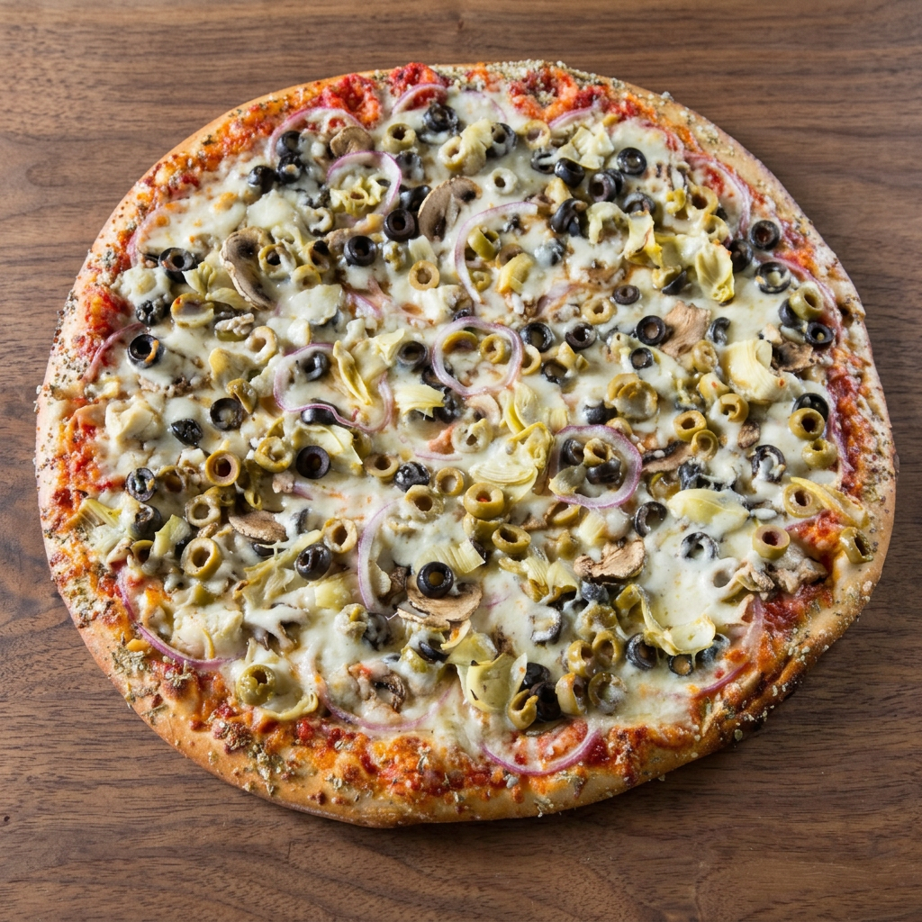 Loaded with red onion, spinach, mushrooms, and green peppers. Feeds 4-5