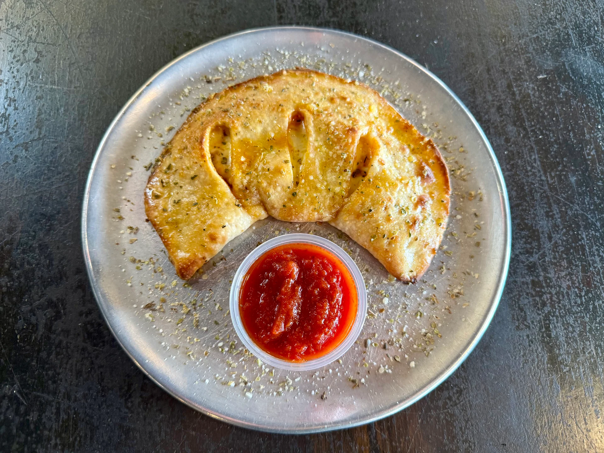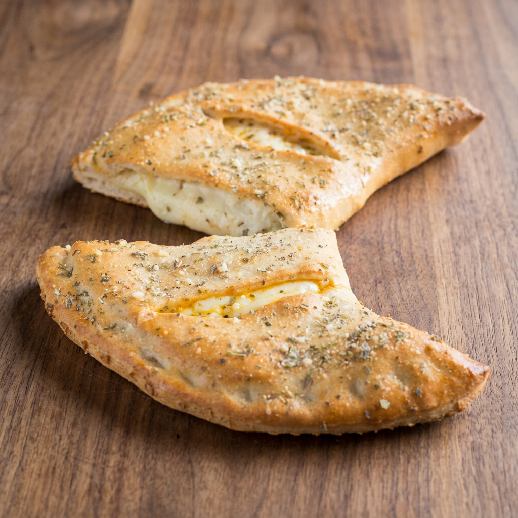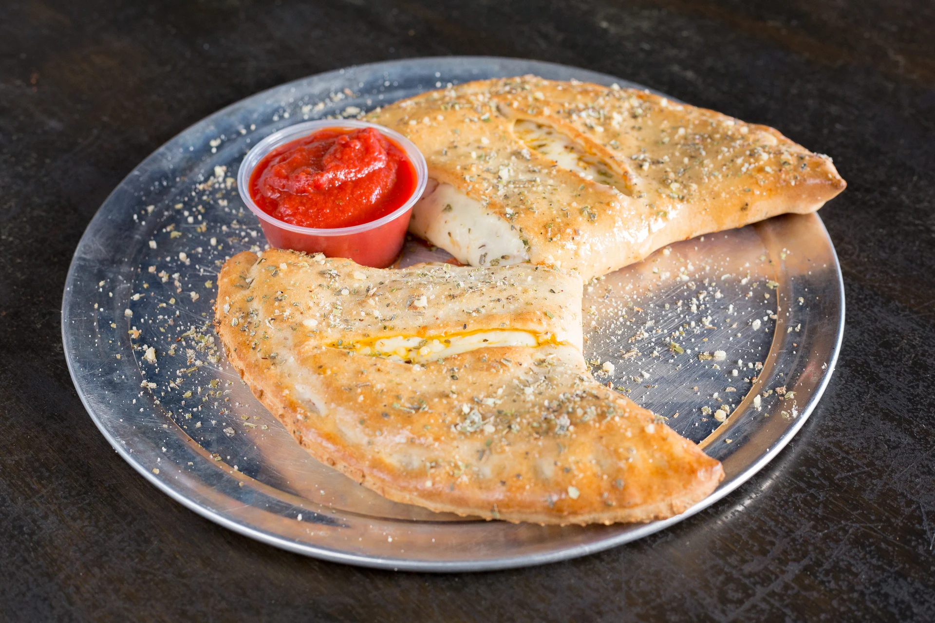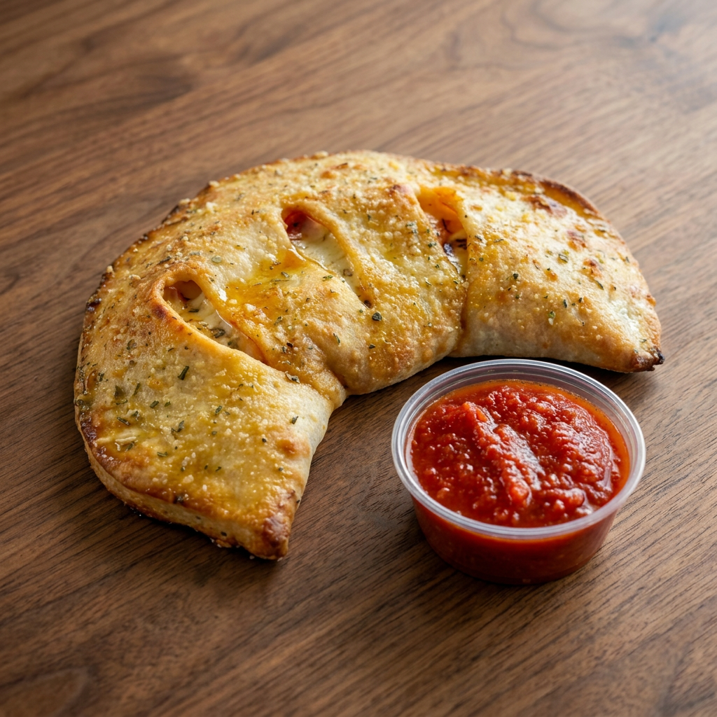 Folded pizza dough stuffed with cheese and one topping. Served with a side of marinara.