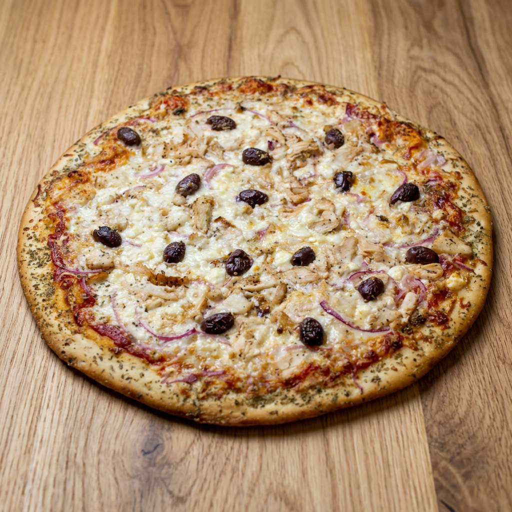 Red onions, feta, minced garlic, kalamata olives, and roasted chicken. Feeds 2-3