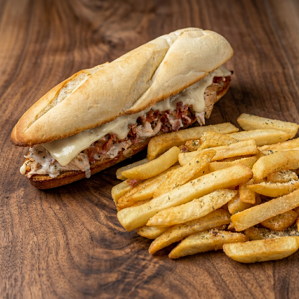 Roasted chicken and provolone, topped with lettuce, basil oil, and tomato-onion dressing. Includes fries and a side of house-made ranch. Substitute a side salad for $1.