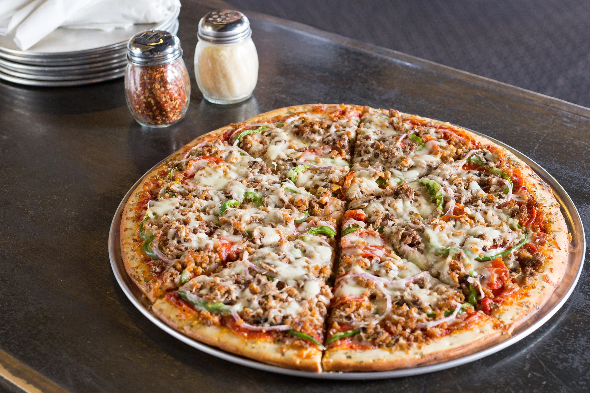 Pepperoni, pork sausage crumbles, ground beef, red onions, mushrooms, and green peppers. Feeds 5-8