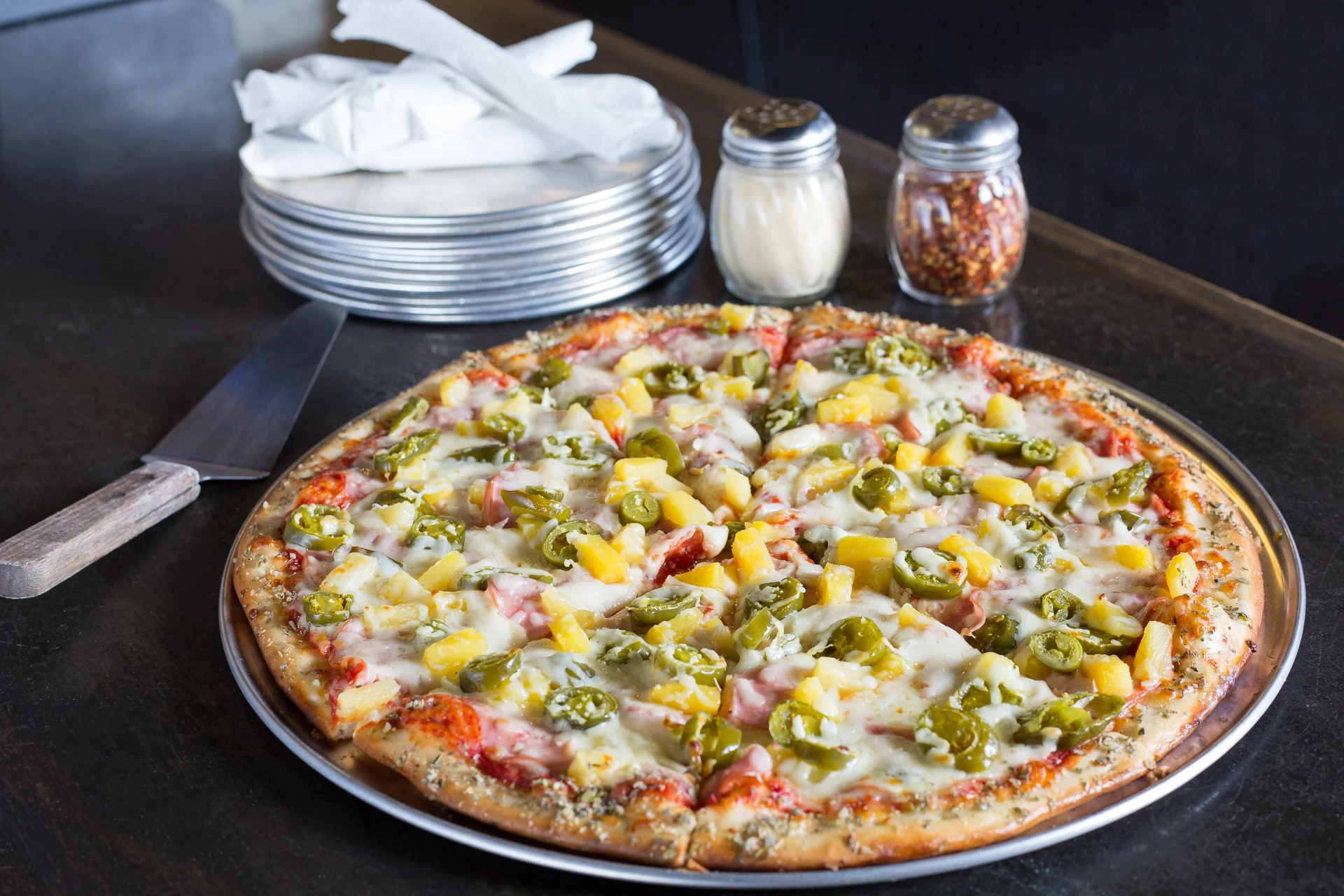 Canadian bacon, pineapple, and jalapeños. Feeds 5-8