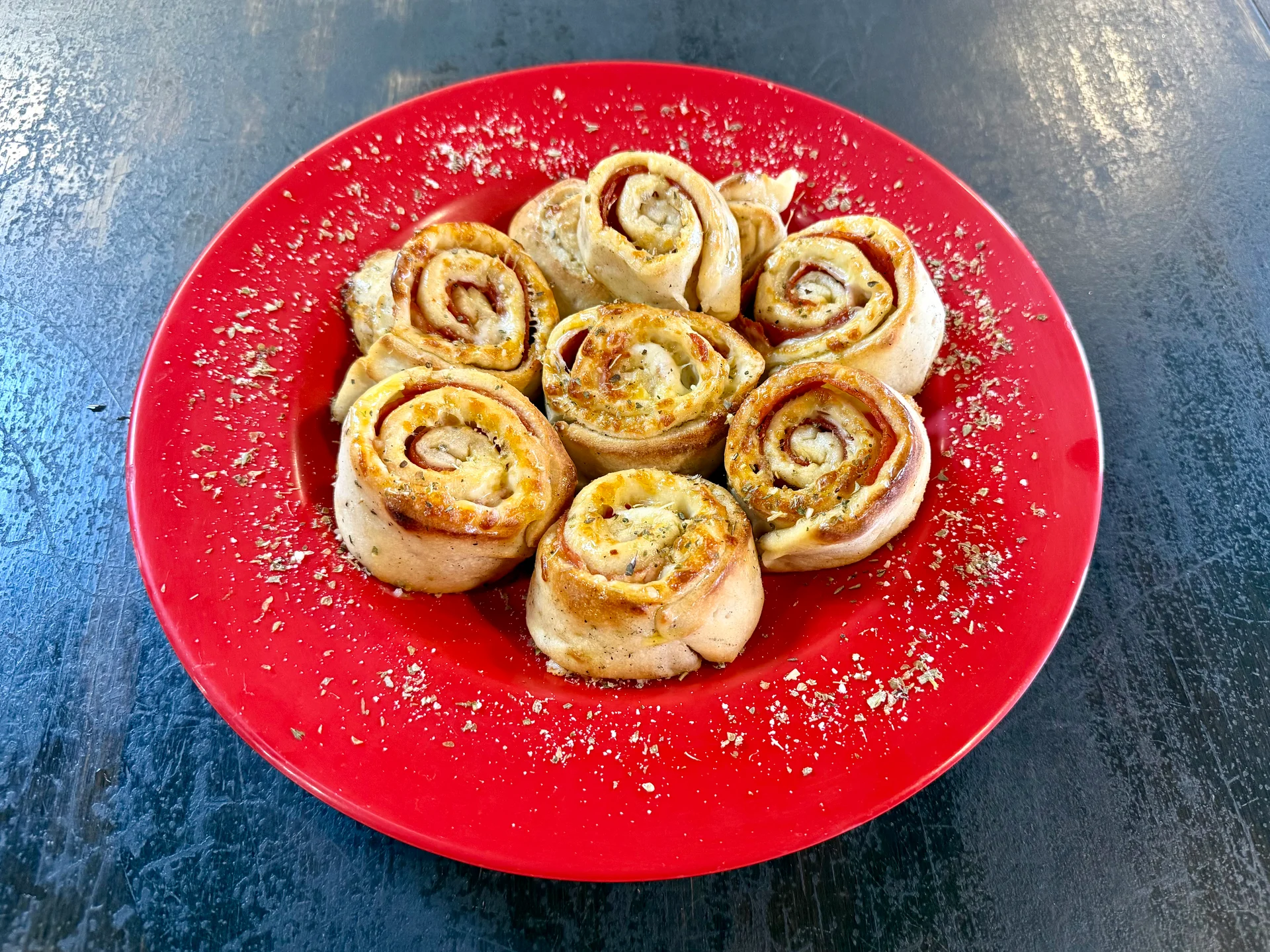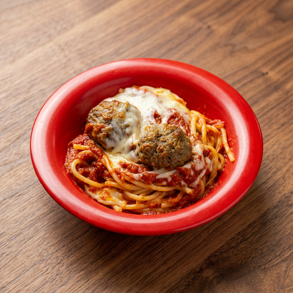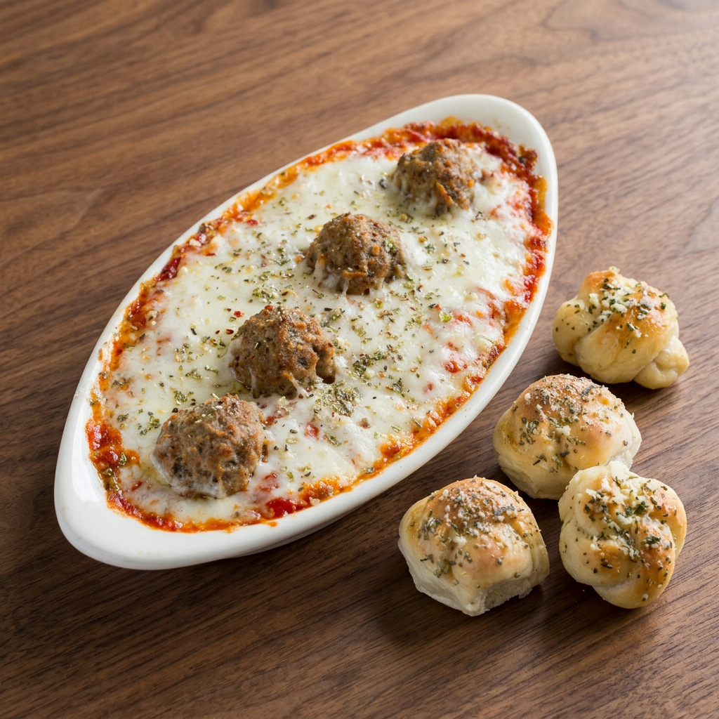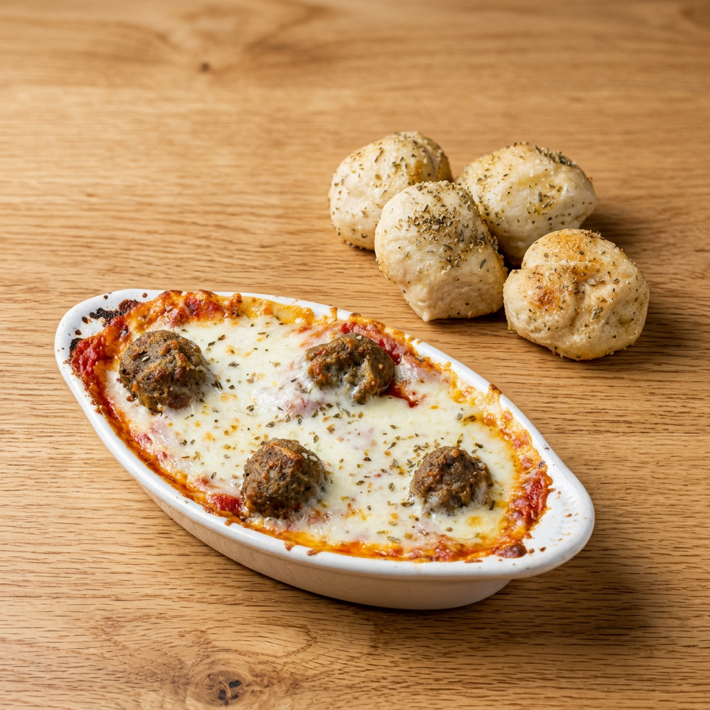 Baked fresh and topped with cheese and meatballs.