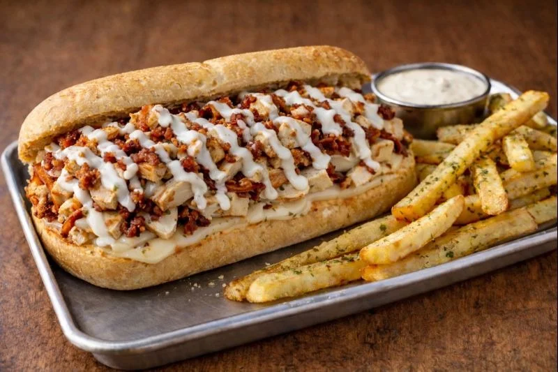Fried or roasted chicken piled high with bacon and drizzled with house-made ranch, served with pepper jack cheese. Includes fries and a side of house-made ranch. Substitute a side salad for $1.