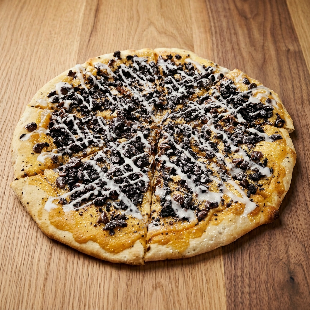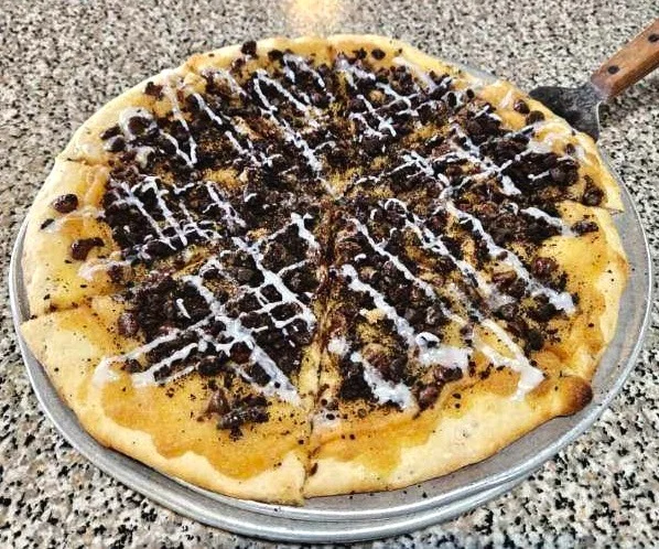 Almost World Famous. Cinnamon sugar base piled with chocolate chips and Oreo pieces, drizzled with icing and sprinkled with powdered sugar. Small feeds 2-3. Large feeds 4-5