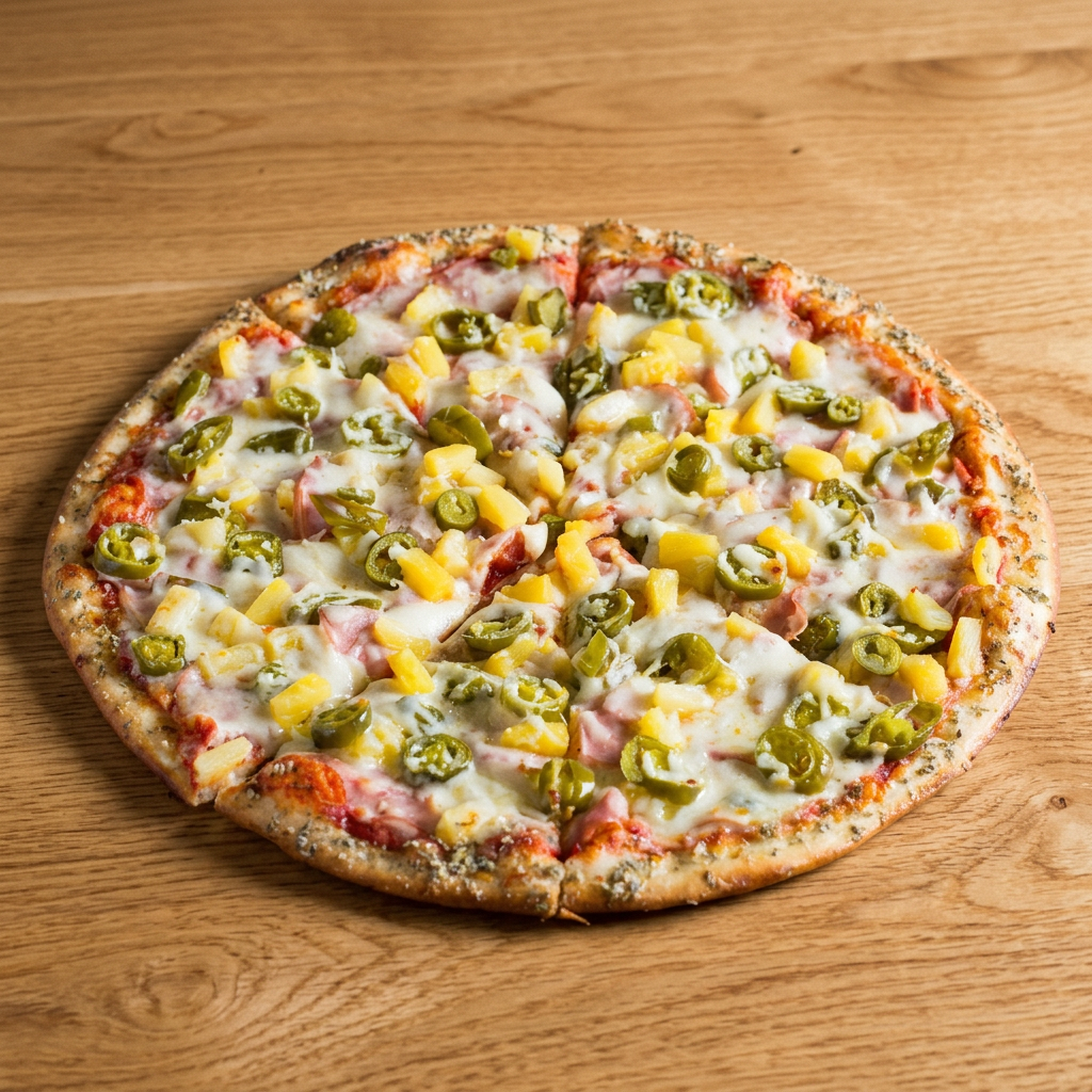 Canadian bacon, pineapple, and jalapeños. Feeds 4-5.