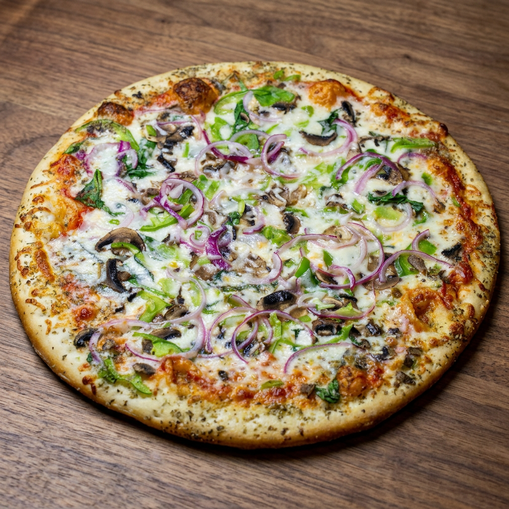 Loaded with red onion, spinach, mushrooms, and green peppers. Feeds 2-3