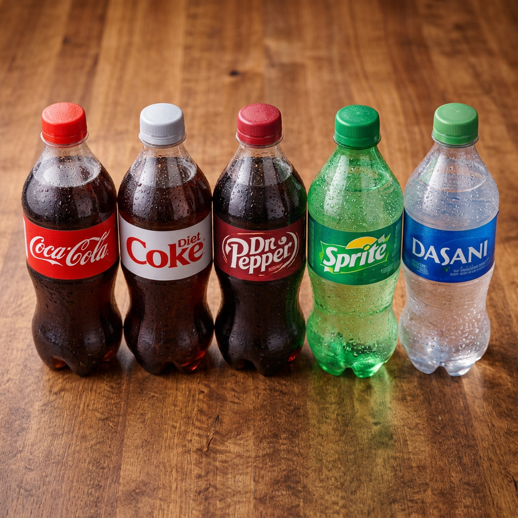A refreshing selection of bottled sodas and waters, served cold.